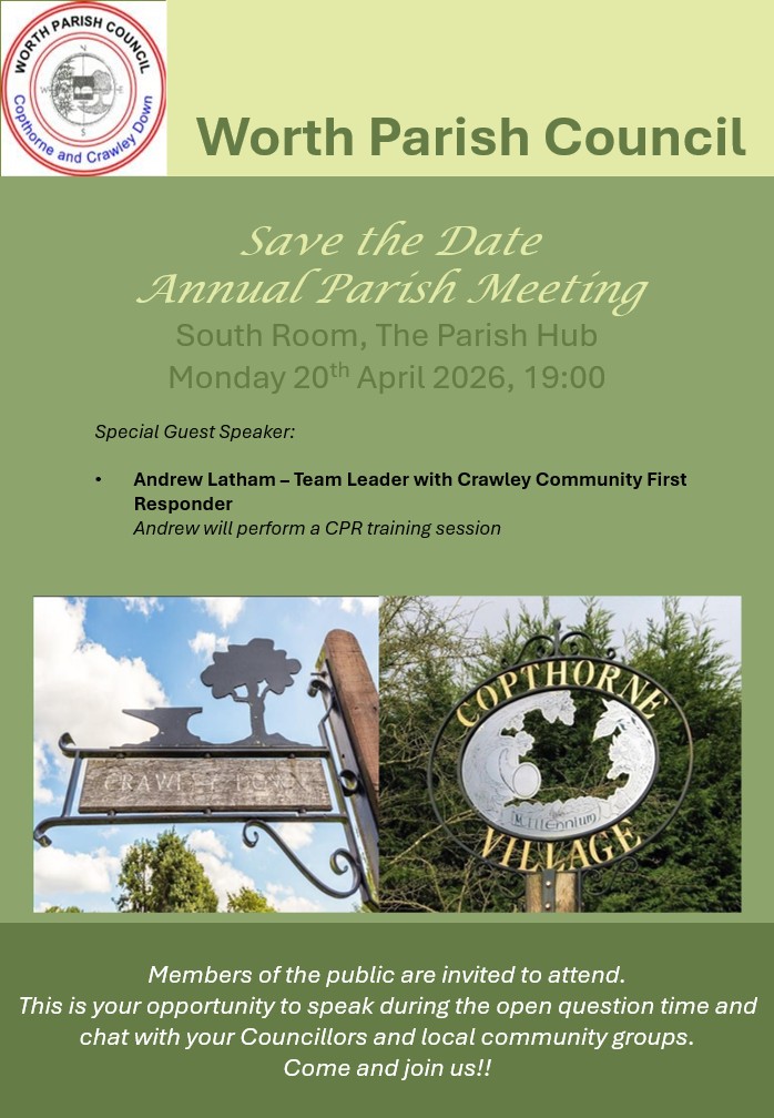 On Monday April 20th at 7pm, Worth Parish Council will be hosting our Annual Parish Meeting at the Parish Hub in Copthorne.